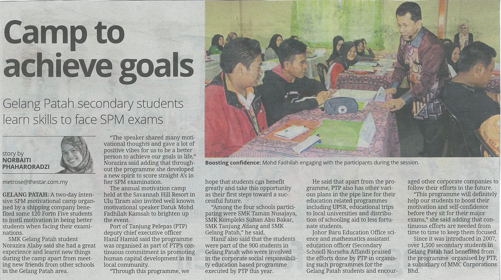 GELANG PATAH: A two-day intensive SPM motivational camp organised by a shipping company benefited some 120 Form Five students to instil motivation in being better students when facing their examinations.