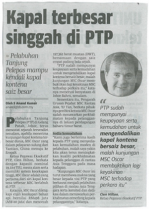 Pelabuhan Tanjung Pelepas (PTP) di Gelang Patah, Johor, terus mencatatkan sejarah tersendiri semalam, apabila menerima kunjungan kapal kontena terbesar dunia, MSC Oscar yang dalam pelayaran sulung dari Yantian, China menuju ke Eropah.