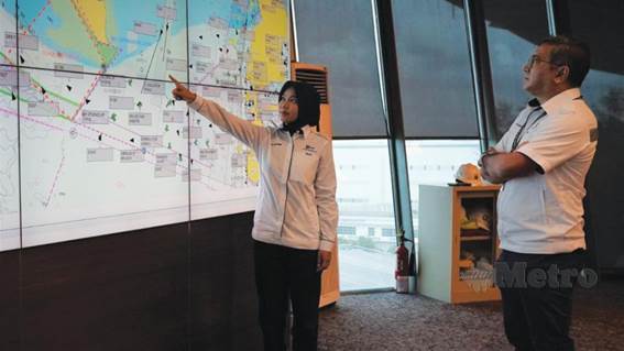 KAPTEN Akashah mendengar taklimat daripada Nurul Arrienne di Bahagian Perkhidmatan Marin, PTP.