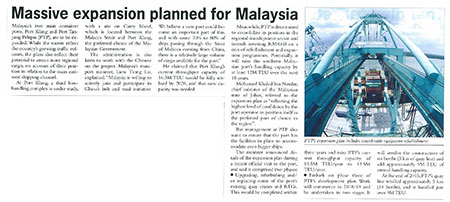 Malaysia’s two main container ports, Port Klang and Port Tanjung Pelepas (PTP), are to be expanded. While the moves reflect the country’s growing traffic volumes, the plans also reflect their potential to attract more regional cargo, on account of their position in relation to the main east-west shipping channel.
