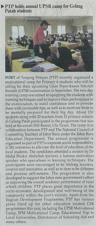 Port of Tanjung Pelepas (PTP) recently organised a motivational camp for Primary 6 students who will be sitting for their upcoming Ujian Peperiksaan Sekolah Rendah (UPSR) examination in September.