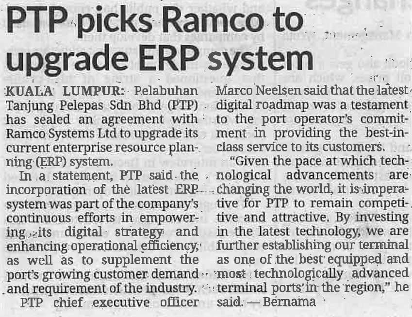 KUALA LUMPUR : Pelabuhan Tanjung Pelepas Sdn Bhd (PTP) has sealed an agreement with Ramco Systems Ltd to upgrade its current enterprise resource planning (ERP) system.