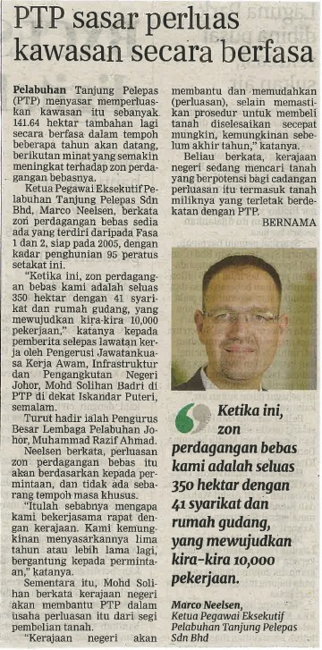 Ketua Pegawai Eksekutif Pelabuhan Tanjung Pelepas Sdn Bhd, Marco Neelsen, berkata zon perdagangan bebas sedia ada yang terdiri daripada Fasa 1 dan 2, siap pada 2005, dengan kadar penghunian 95 peratus setakat ini.