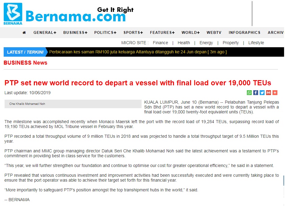 KUALA LUMPUR, June 10 (Bernama) -- Pelabuhan Tanjung Pelepas Sdn Bhd (PTP) has set a new world record to depart a vessel with a final load over 19,000 twenty-foot equivalent units (TEUs).