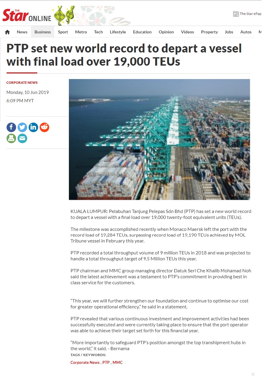 KUALA LUMPUR: Pelabuhan Tanjung Pelepas Sdn Bhd (PTP) has set a new world record to depart a vessel with a final load over 19,000 twenty-foot equivalent units (TEUs).