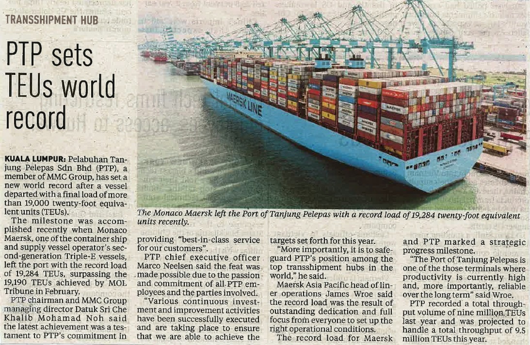 Pelabuhan Tanjung Pelepas Sdn Bhd (PTP), a member of MMC Group, has set a new world record after a vessel departed with a final load of more than 19,000 twenty-foot equivalent units (TEUs).