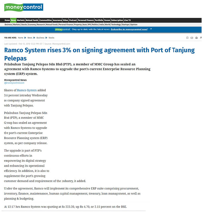 Shares of Ramco System added 3.4 percent intraday Wednesday as company signed agreement with Tanjung Pelepas.